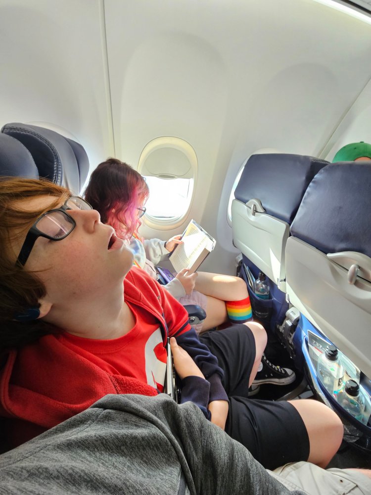 We score pretty decent seats all in a row. Been a minute since I boarded a plane. I slide right into my seat and grab the belt to strap in. Will this thing fight me? The gym and the meal planning are showing results. This seat fits just fine and the belt went on with ease with several inches to spare. Watching all these other folks board made me feel I am doing something right. Parents with bored teens. Cranky adults. Parents with smaller kids who you could tell were clearing their throats to really scream with gusto once the wheels left the runway. My traveler buddies were settled in immediately and doing their thing nary a word for 900 miles.